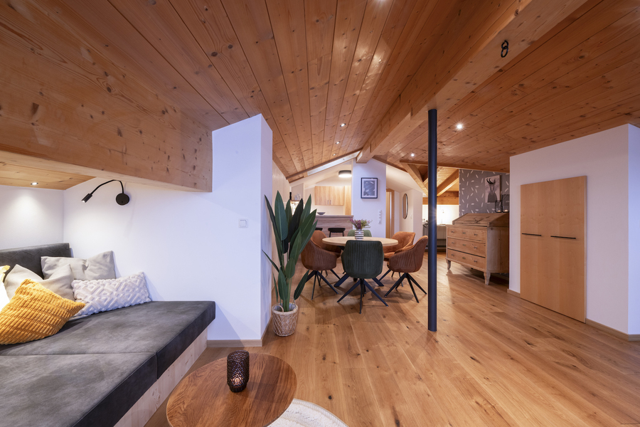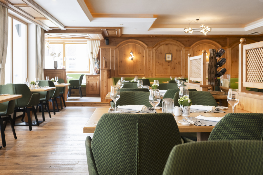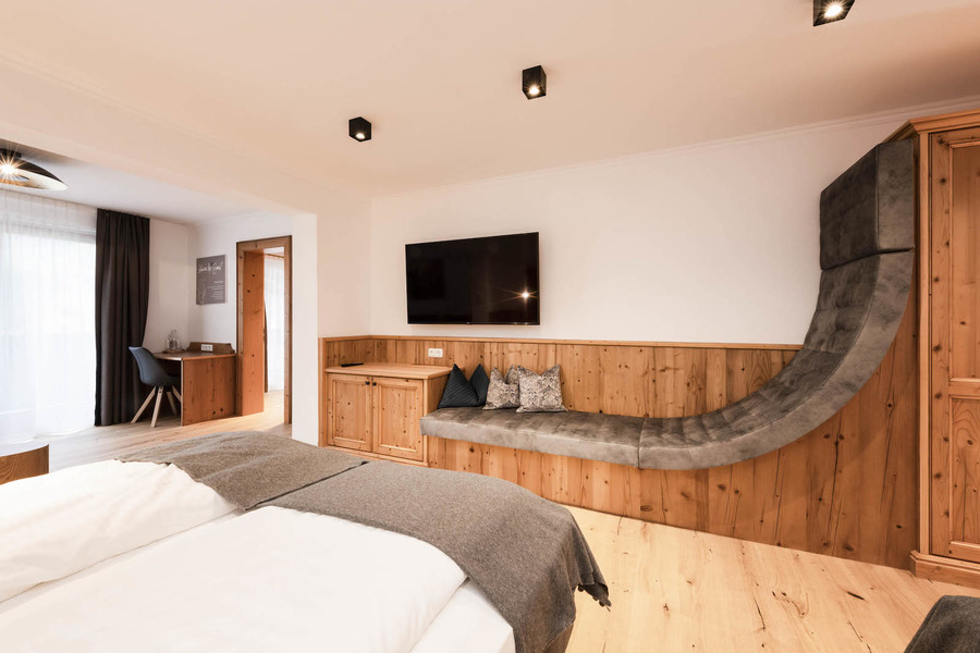 Rooms and suites combine warm alpine character with modern comfort. Natural wood, soft textiles and thoughtful details create an inviting atmosphere, while balconies frame panoramic views of the surrounding mountains. From cosy doubles to spacious family suites and apartments, each space offers a peaceful retreat after a day outdoor