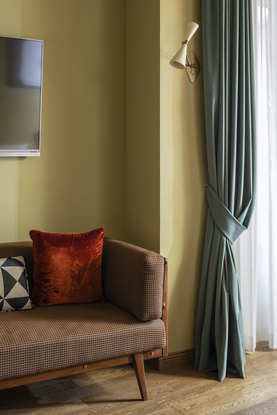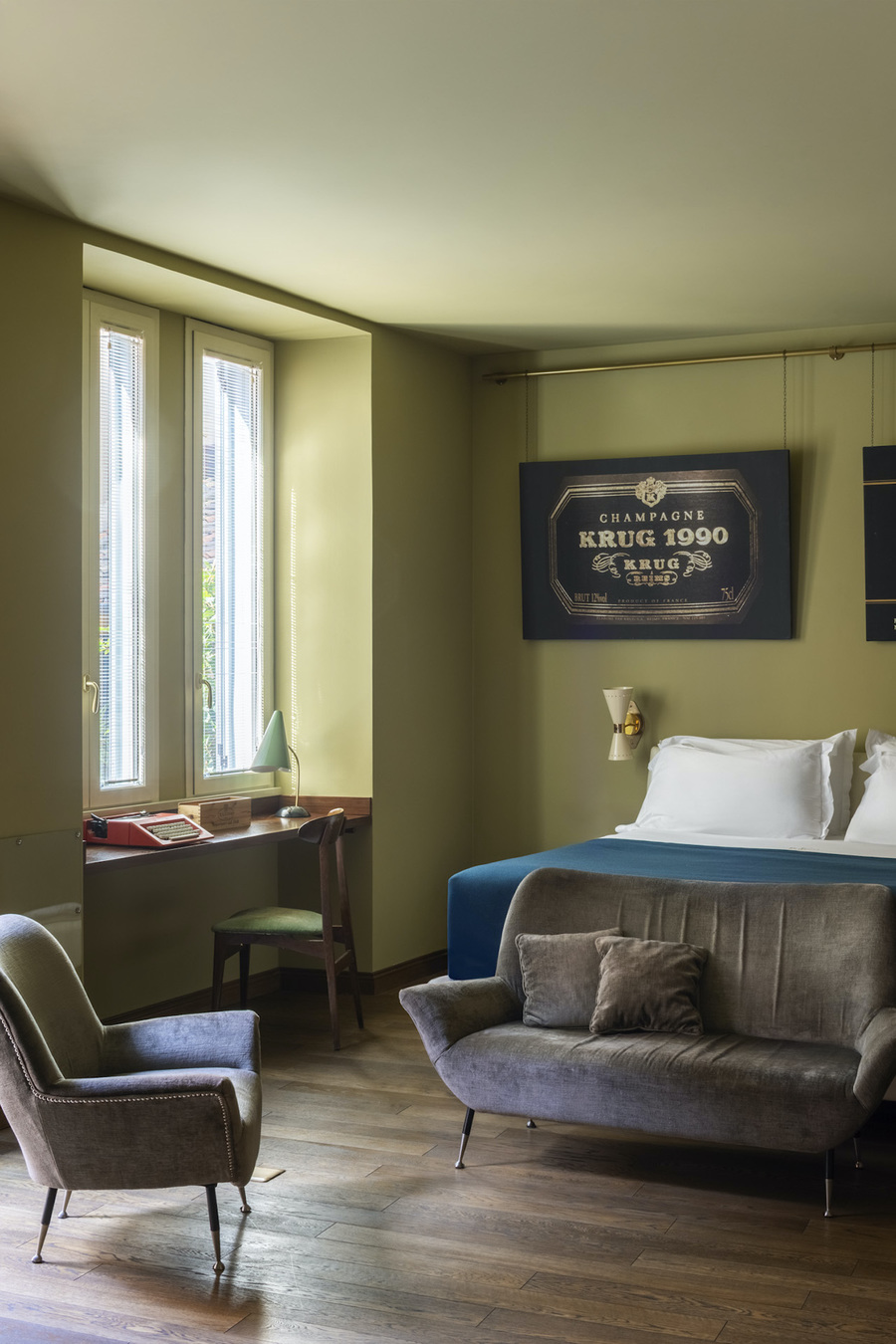 Each suite is individually styled with mid-century furnishings, vintage accents, and hand-painted murals, creating a visual story of Rome’s golden era. Bathed in natural light, the interiors recall the Italian design of the Sixties, complete with frescoes by Andrea Ferolla depicting iconic Roman scenes. Not to mention every suite includes a personal wine cellar!