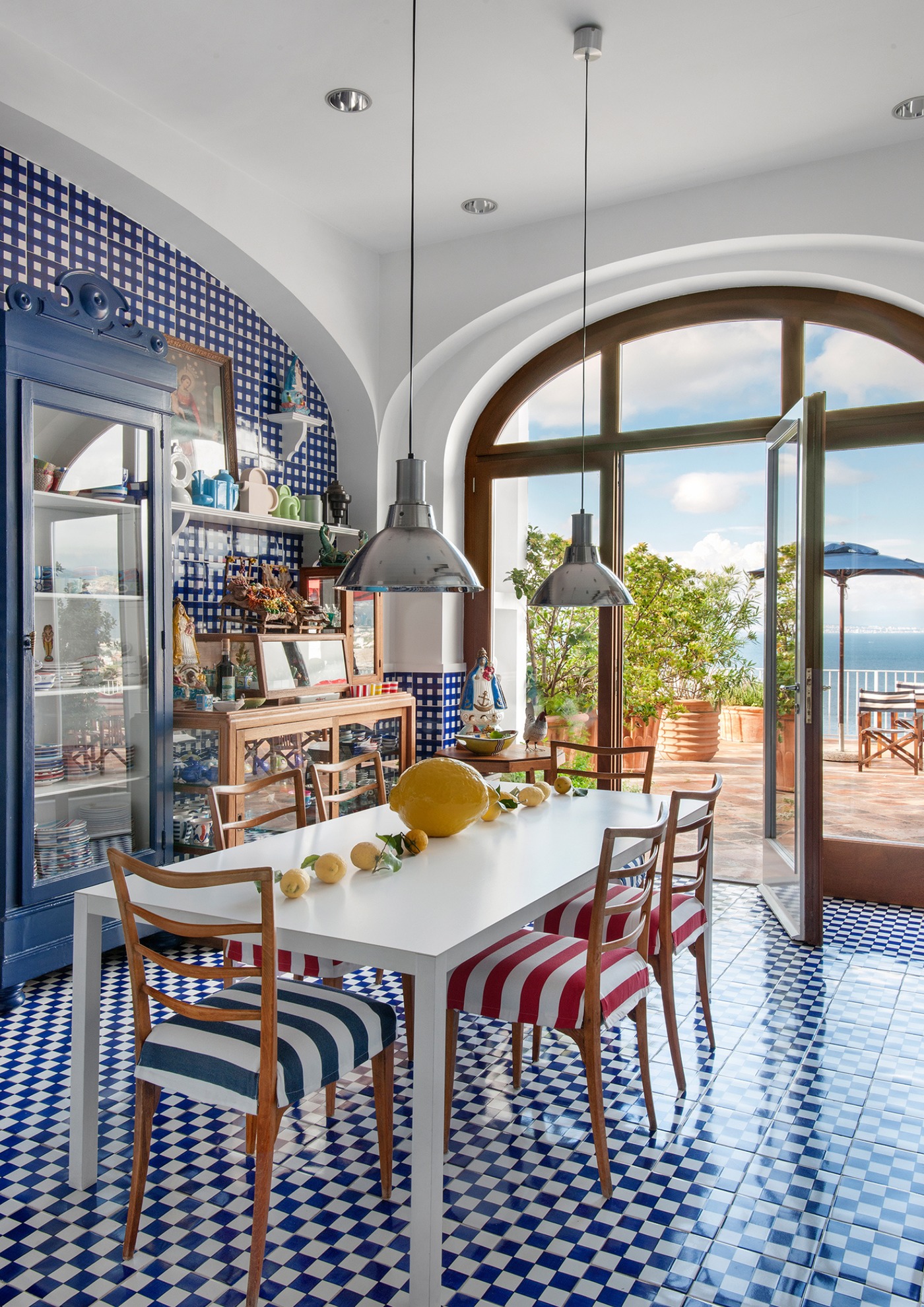 Sunlight dances across the terraces of Maison La Minervetta, casting cerulean reflections onto walls painted in Mediterranean hues. Here, every detail — from vintage ceramics to locally sourced artworks — mirrors the coastal charm of Sorrento. Floor-to-ceiling windows frame Capri and Vesuvius, creating a dialogue between the interior and the dramatic landscape beyond.